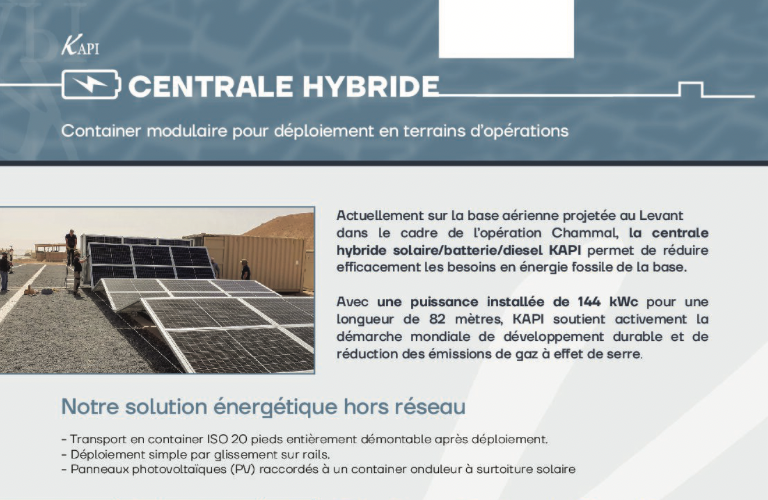 Actuellement sur la base aérienne projetée au Levant dans le cadre de l’opération Chammal, la centrale hybride solaire/batterie/diesel KAPI permet de réduire efficacement les besoins en énergie fossile de la base.